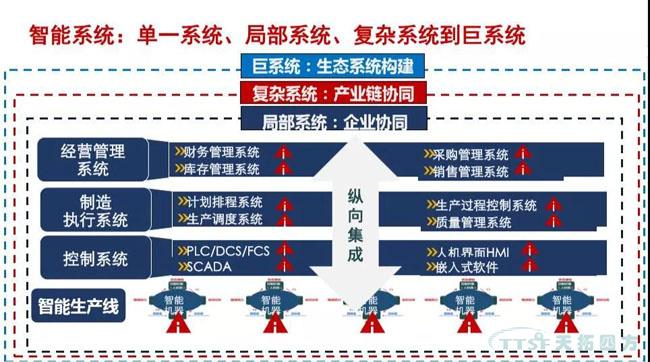 德國工業4.0講橫向集成、縱向集成、端到端集成,從這個角度來講,什么是集成?集成是數據的互聯互聯網互操作,集成的本質就是對制造資源優化范圍、領域深度的描述,從自動化到智能化,就是從局部優化到全局優化的過程,在時間上優化只有起點沒有終點,空間上參與優化的資源從點、線、面、大系統、巨系統的方向不斷地擴展。如果說,自動化是單點的、低水平的,有限的資源優化;那么,智能化是多點、高水平、全局的資源優化。所謂集成的過程,就是對制造過程的范圍領域不斷地深化的過程。