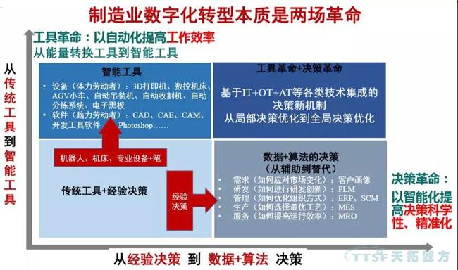 數字化轉型,本質是兩場革命:工具革命和決策革命。人們去一個地方可以選擇步行、可以開車、可以乘飛機,這叫工具,工具決定了能走得多快;但是,離目的地是不是越來越近,還取決于你的決策是否正確。數字化轉型本質上就是解決兩個基本問題:正確地做事和做正確的事。