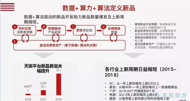 在不確定性的環境中進行決策是企業面臨的巨大挑戰,從基于經驗的決策到基于數據+算法的決策,是企業數字化轉型的基本模式。天貓聯合瑪氏、雀巢等多家一線品牌,聯合建立新品創新中心,基于數據和新商業邏輯,洞察新品機會、提高研發效率,3  C、服裝、美裝、電器等新產品研發周期大幅縮短。
