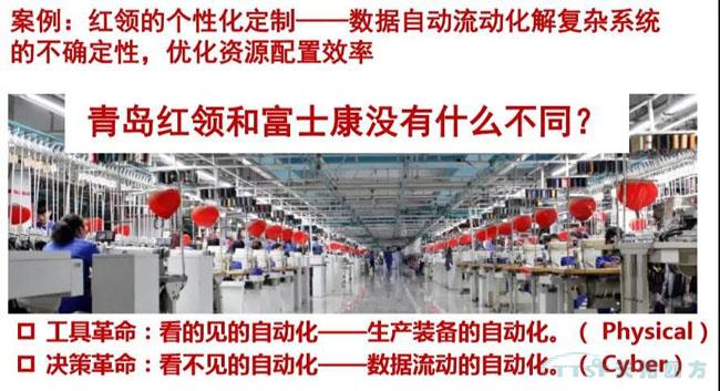 我們認為自動化分為兩種。一種自動化是生產裝備自動化,叫做看得見自動化,或者定義成工具革命,數控機床、機器人、立體倉庫、忙碌而有序的AGV小車。還有一種叫做看不見的自動化,數據流動的自動化,把正確的數據在正確的時間傳遞給正確的人和機器,或者定義成決策革命。當你采集一個人上身的18個部位,22個指標之后,這一個指標首先自動生成一個適合這個人體型的一個版型,自動生成一個數控機床的加工指令,自動生成200個工序的加工工藝,定制化生產跟規模化生產相比,其復雜度、面臨的不確定性遠遠地超出幾個量級。