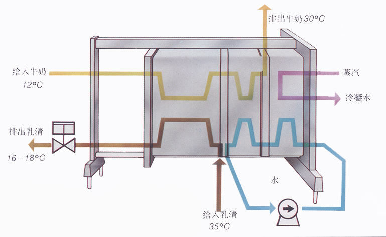 來自乳清的廢熱傳遞給A段的牛奶。B、C段為安全的備用系統;當沒有乳清時,通過一個閉合的蒸汽加熱水系統來對牛奶進行加熱。